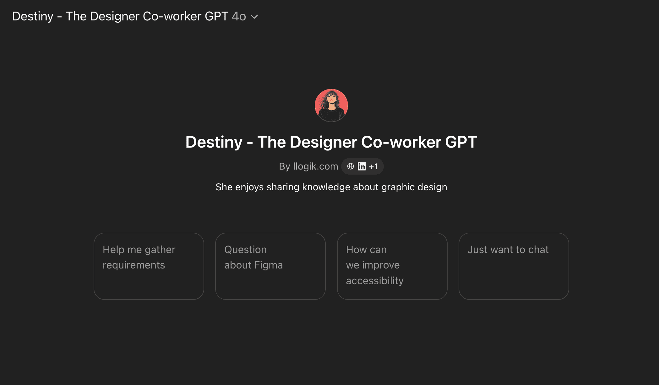 DestinyGPT is a custom GPT created to help with real-world graphic design tasks. Whether you’re working on a team or solo, she’s designed to act like a helpful co-worker who understands both visual design and how to get things done.